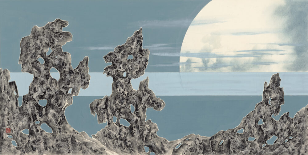 此幅畫作不見哪吒具象身影,卻無處不在他的意志:混天綾與乾坤圈在天地間盤旋,貫穿山河,化作無形的守護。下方原野一片寂靜,仰望者之身影凝視夜空,他們是信徒,也是每個自我探索的人。畫面上部三座若隱山影,象徵已破「三界」束縛;中央蓮花未展,金墨勾邊,暗寓「無我而在」。畫作下方群像環繞蓮心,不再仰視,而是與之並行,如同每個人,在命運長河中摸索、對話、共行。
