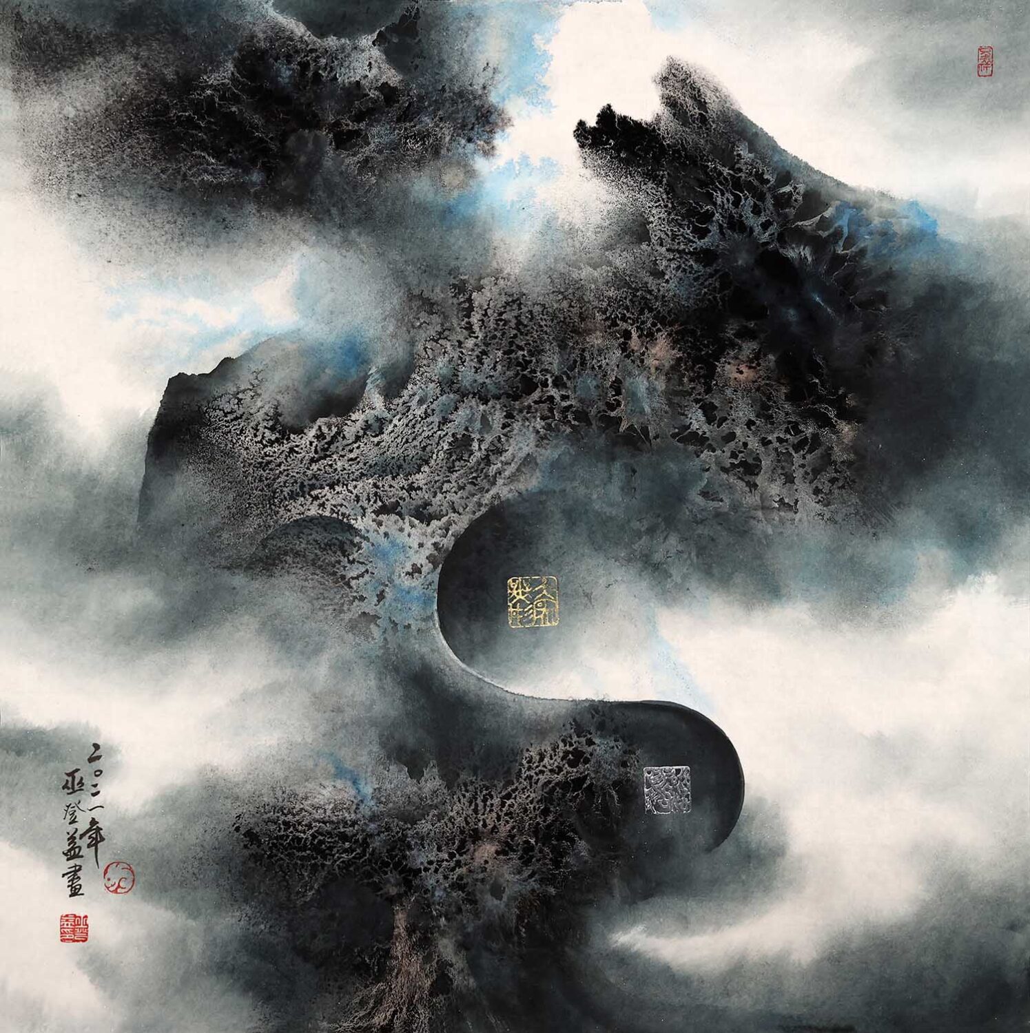 畫面中繞山的雲霧呈現出奇妙的太極圖像,